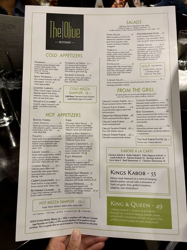 “ I recently dined at The Olive Restobar in Downey and was impressed by their friendly and attentive service. We started with a Mimosa Flight and lattes with adorable butterfly latte art The King’s Kabob stole the spotlight with its dramatic hanging skewer presentation. The Surf & Turf was my fav–the jumbo shrimp paired wonderfully with the creamy spiced mash Here’s what we ordered: Mimosa Flight Lattes (with butterfly latte art!) Cold Mezza Sampler – Hummus, spicy hummus, loaded labneh, yogurt & cucumber Crispy Cauliflower – Flash-fried with tahini Surf & Turf – Herb-crusted ribeye, grilled jumbo shrimp, spiced mash, veal demi-glaze King’s Kabob – Hanging ribeye skewers with garlic fries, grilled tomatoes, jalapeño, and chimichurri Baklava with Pistachio Ice Cream – Flaky pastry filled with crushed pistachios, lightly sweetened with syrup, and served with creamy pistachio ice cream ”